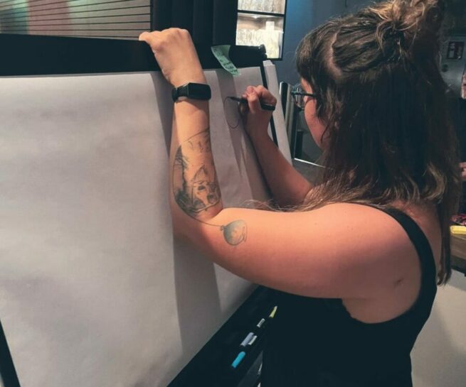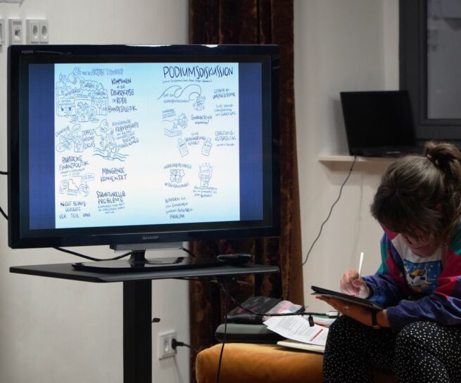 Graphic Recording , ist ein visuelles, live entstandenes Protokoll. Inhalte aus Gesprächen, Vorträgen, Events, Kongressen, Konferenzen oder auch Workshops werden in Bilder und Stichworte übersetzt. So werden auch komplexe Themen leicht verständlich aufbereitet. Parallel zu einem Event, Meeting oder einem anderen Prozess hält die Graphicrecorderin die Inhalte grafisch fest. Meist geschieht dies live vor Ort, aber auch remote ist möglich. Hierbei greift die Graphicrecoderin nicht in den Prozess mit ein sondern dokumentiert lediglich.