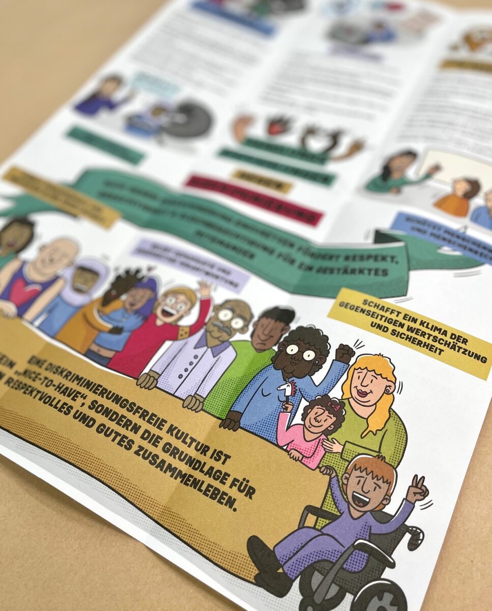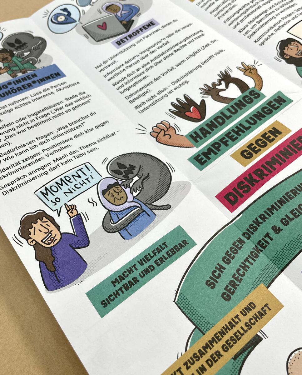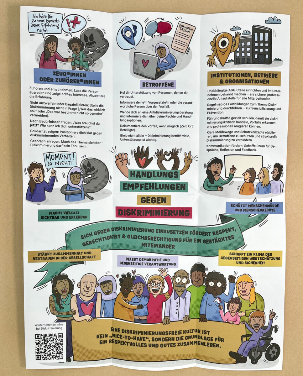 Die Antidiskriminierungskarte ist als praktischer Faltflyer konzipiert, der Information und Ermutigung verbindet: