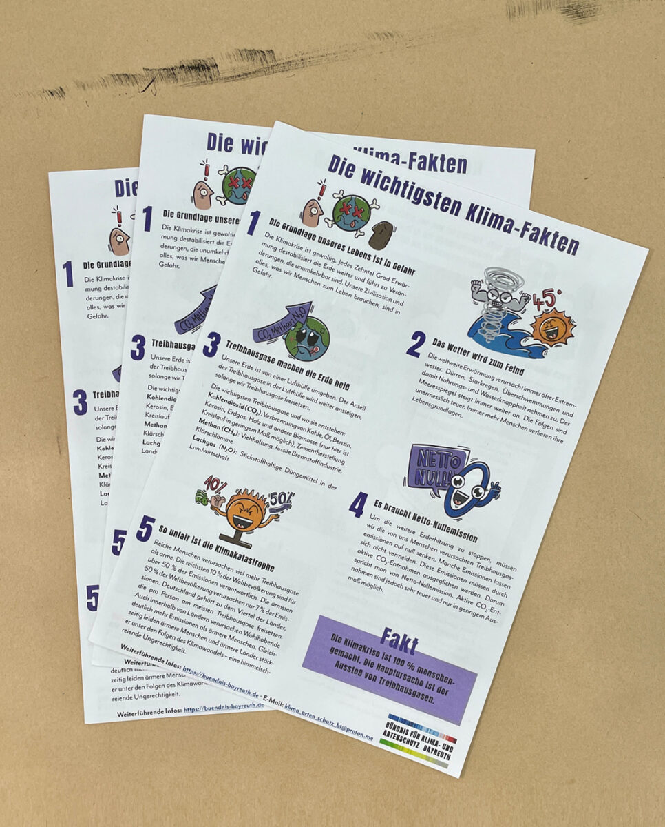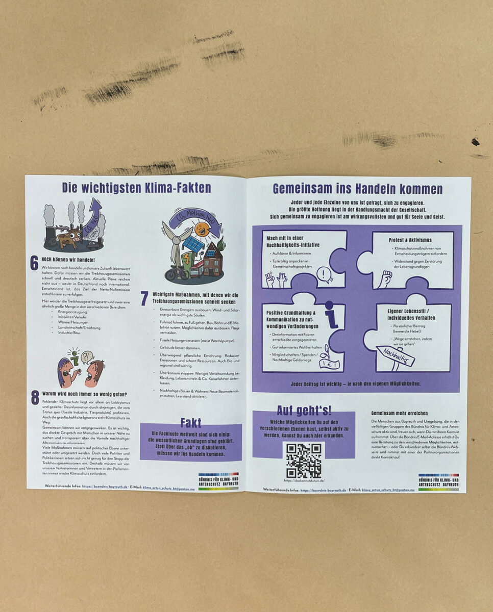 Für das Klimabündnis Bayreuth habe ich einen A4-Flyer gestaltet, der zentrale Klimafakten prägnant und zugänglich vermittelt. Das Layout verbindet klare Textblöcke mit einer Illustrationsebene, die komplexe Inhalte verständlich macht und gleichzeitig visuell ansprechend hält. Der Flyer dient dem Bündnis als Diskussionsgrundlage und begleitet Vorträge rund um die Klimakrise.