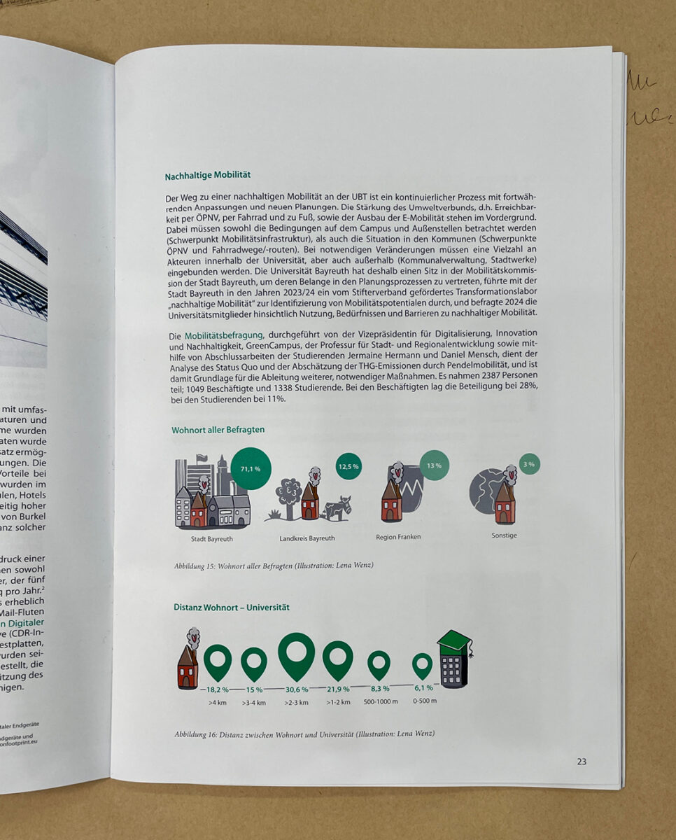 Für die Universität Bayreuth habe ich den Nachhaltigkeits- und Mobilitätsbericht visuell umgesetzt. Dazu gestaltete ich die komplette PDF für die Moblitätsbefragung sowie eine Reihe von Infografiken, die ich mit prägnanten Illustrationen kombiniert habe.